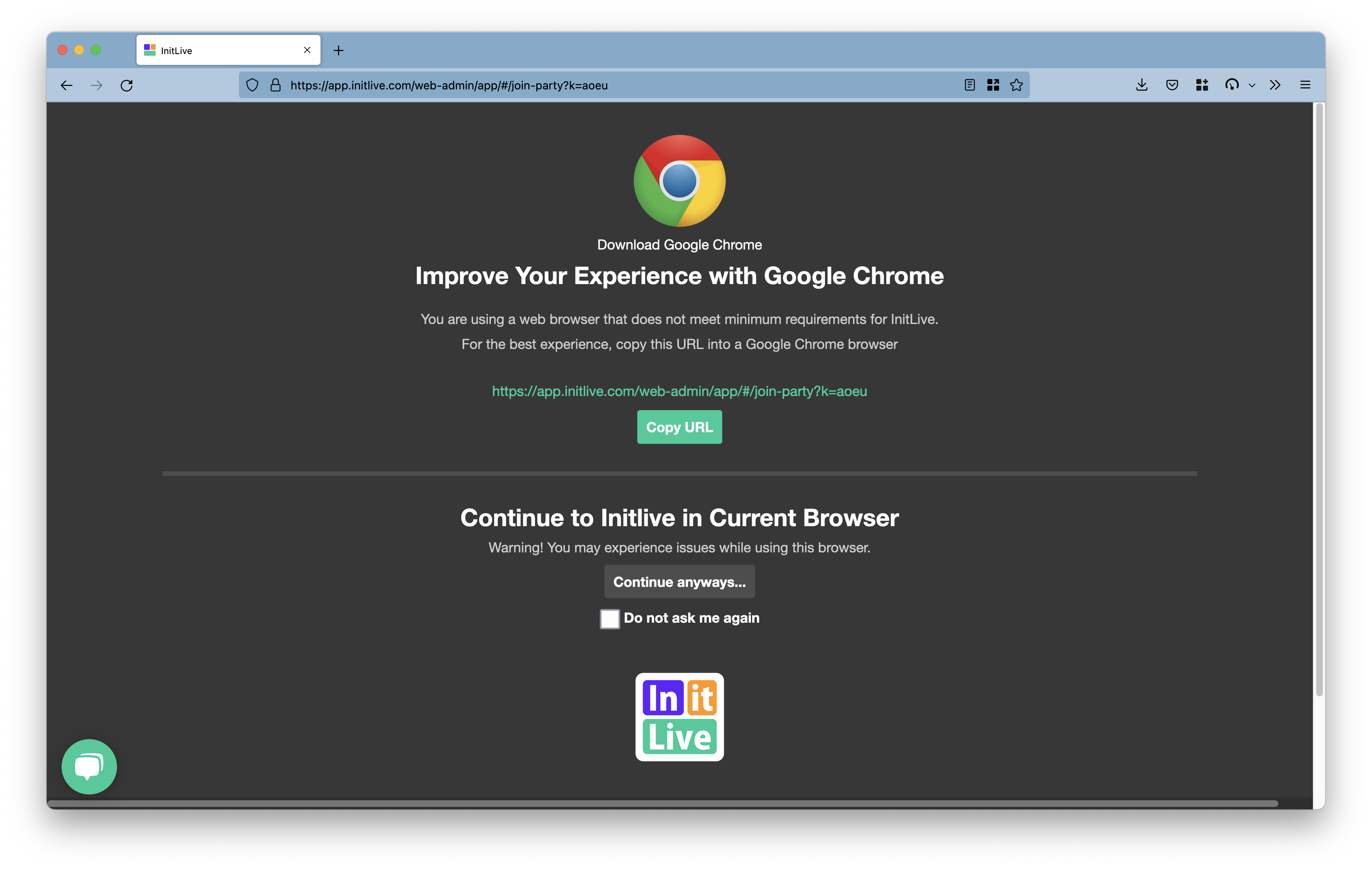 **Environment:** Operating system: Mac OS X 10.15 Originally reported Firefox version: Firefox 109.0 Last reproduced with the following UA: Mozilla/5.0 (Macintosh; Intel Mac OS X 13.4; rv:126.0) Gecko/20100101 Firefox/126.0 Platforms reproduced on: windows,mac,linux **Steps to reproduce:** URL: https://app.initlive.com/web-admin/app/#/join-party?k=aoeu Hardware: FF 101.0.1 on macOS 12.4 ### Steps to reproduce - Go to provided URL (note: I arbitrarily modified the `k=<param>` so I wasn't sharing my specific link) ### Expected results Page opens ### Actual results "Use Chrome" warning page is shown **Actual Behavior:** app.initlive.com says to download Chrome instead of just displaying page Created from https://github.com/webcompat/web-bugs/issues/117794