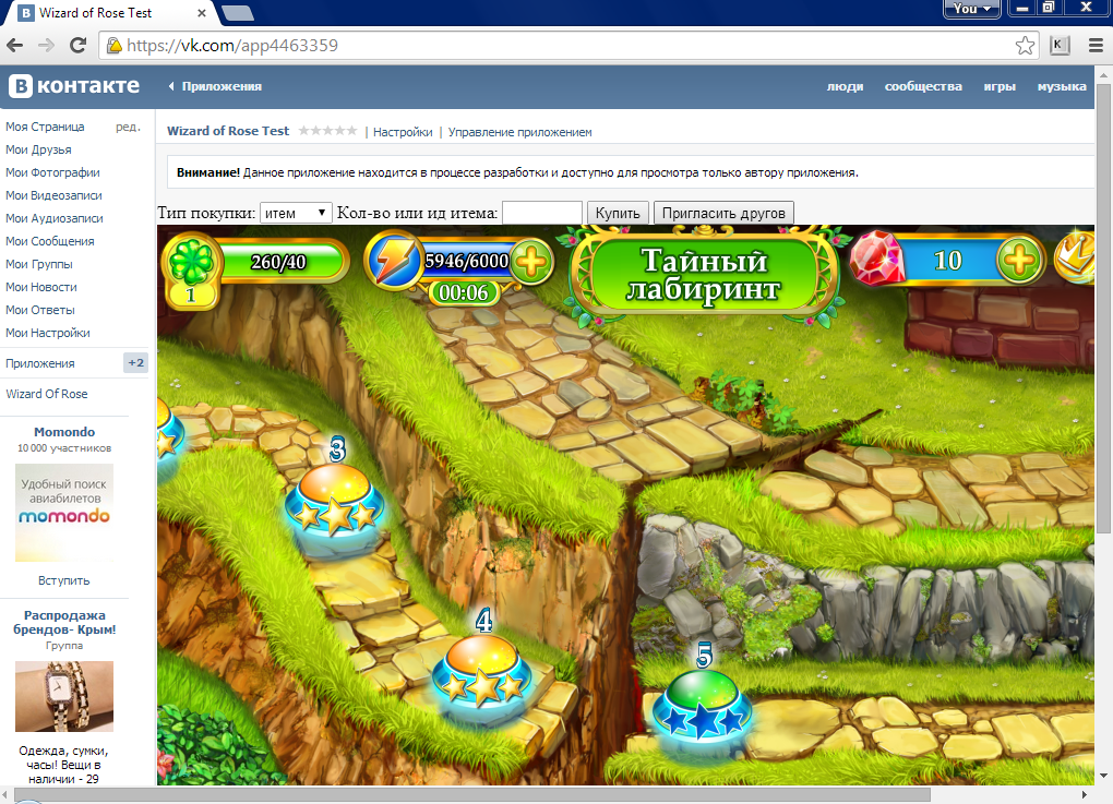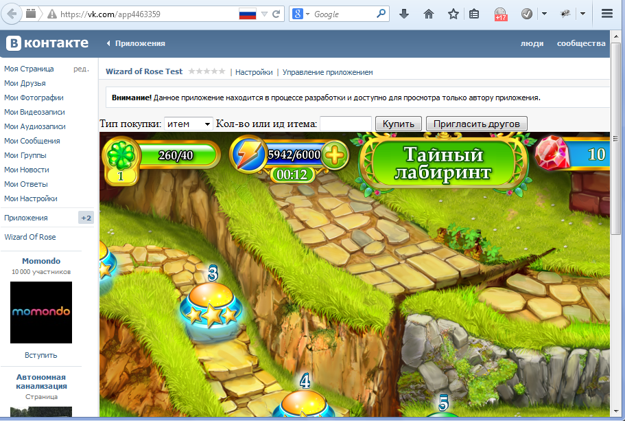 Created an IFrame type Game on vk.com. Wrote the code for Iframe. Watched in Firefox.