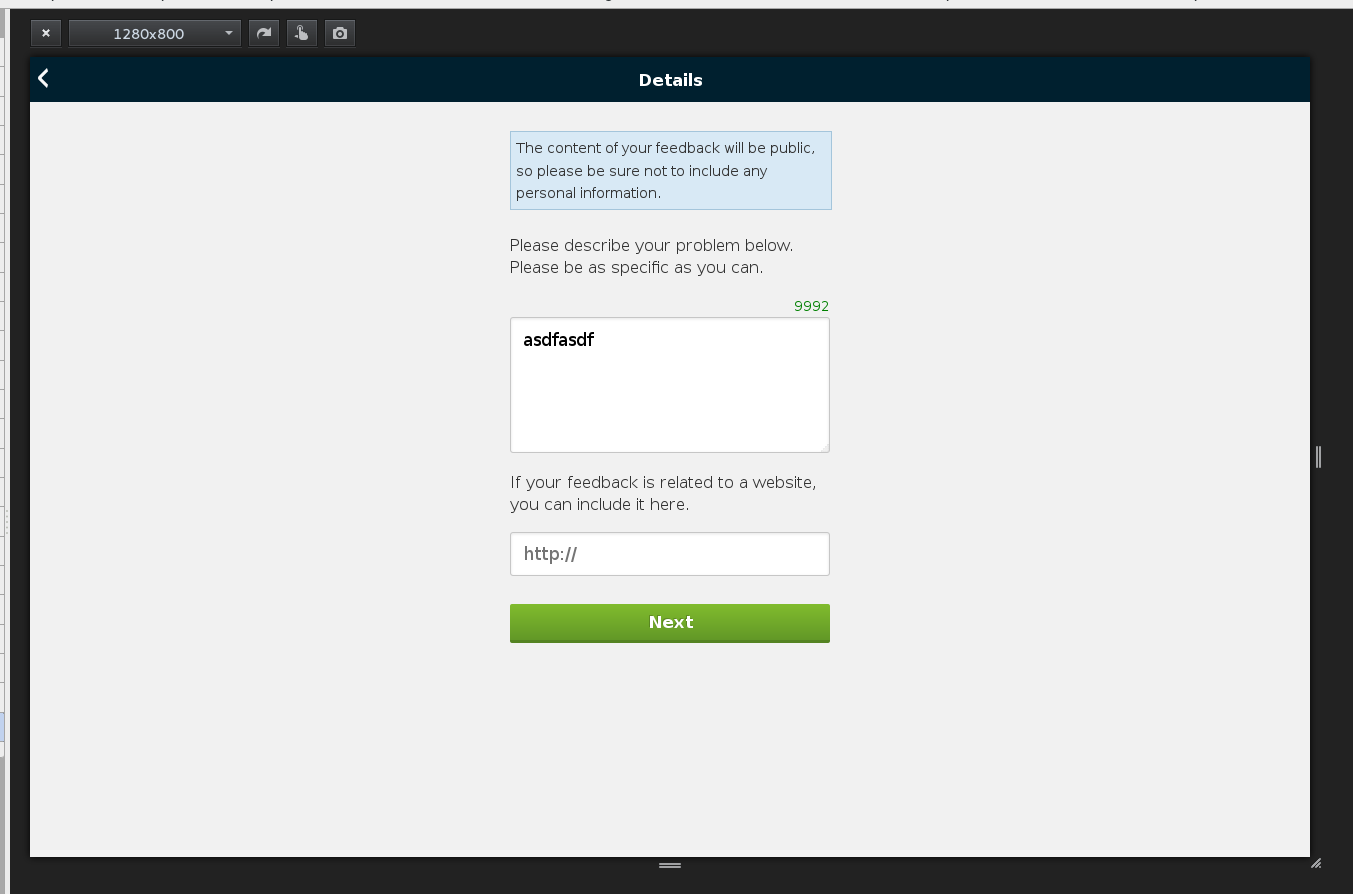 After filling in the text boxes, the "Next" button was not visible (off the bottom of the screen) and would not scroll into view. When I rotated the screen into portrait mode, the "next" button was visible, and I was able to submit my input.