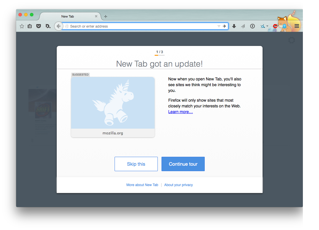 I've been more and more bothered for the last few weeks by the newtab intro's use of the Whimsycorn to introduce Sponsored Tiles, because selling advertising space in Firefox doesn't seem particularly whimsical to me. Would you mind changing it to, say, the single-color Firefox image instead?