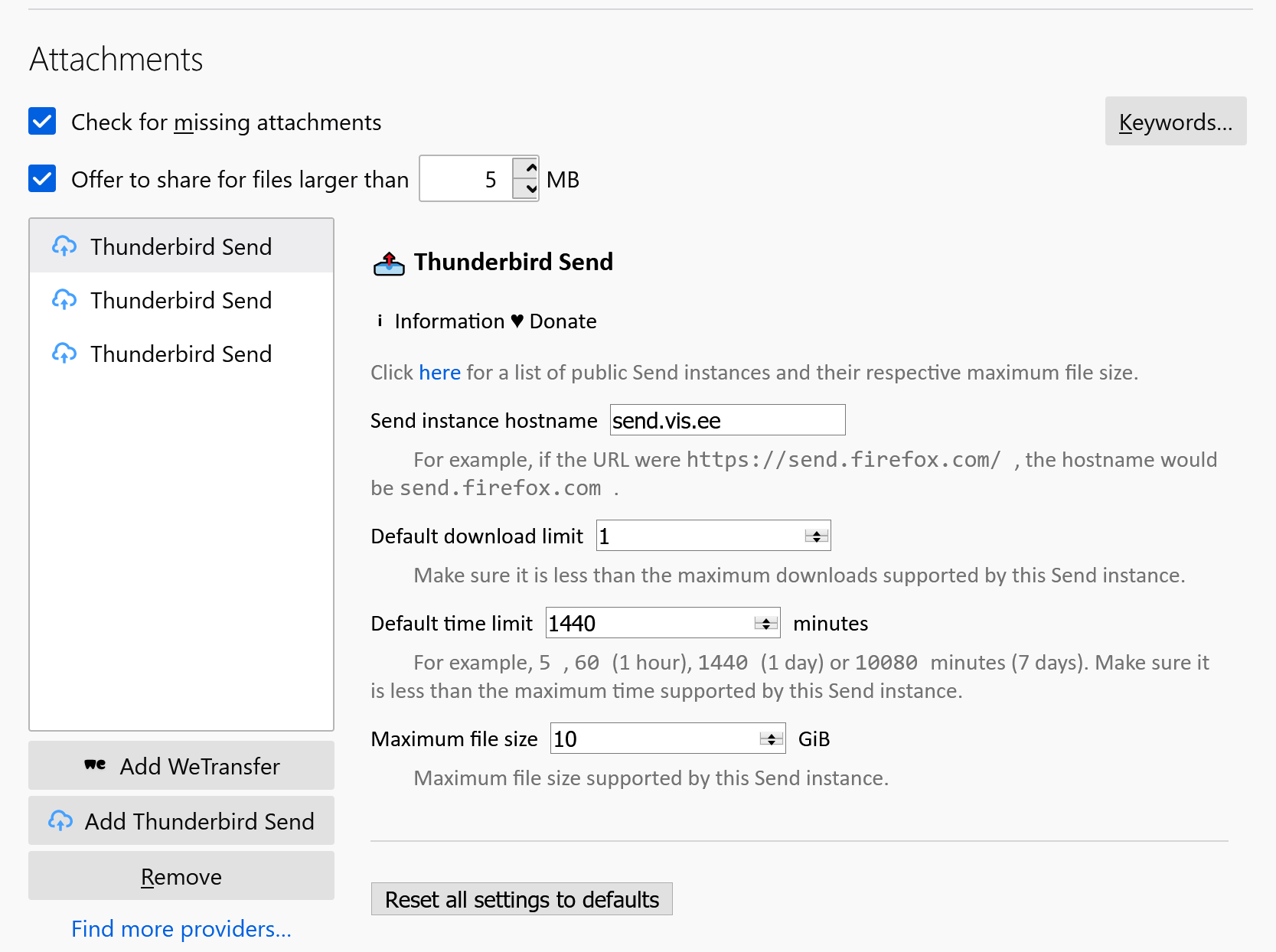 I have a "FileLink provider for Send" add-on that I just created and am currently testing. It allows users to enter the hostname of the Send instance they want to use, along with other info (see screenshot here). It will then encrypt and upload the files to that Send server. At some point, I may submit the add-on to ATN, although it would of course be best if this functionality were integrated into Thunderbird.
