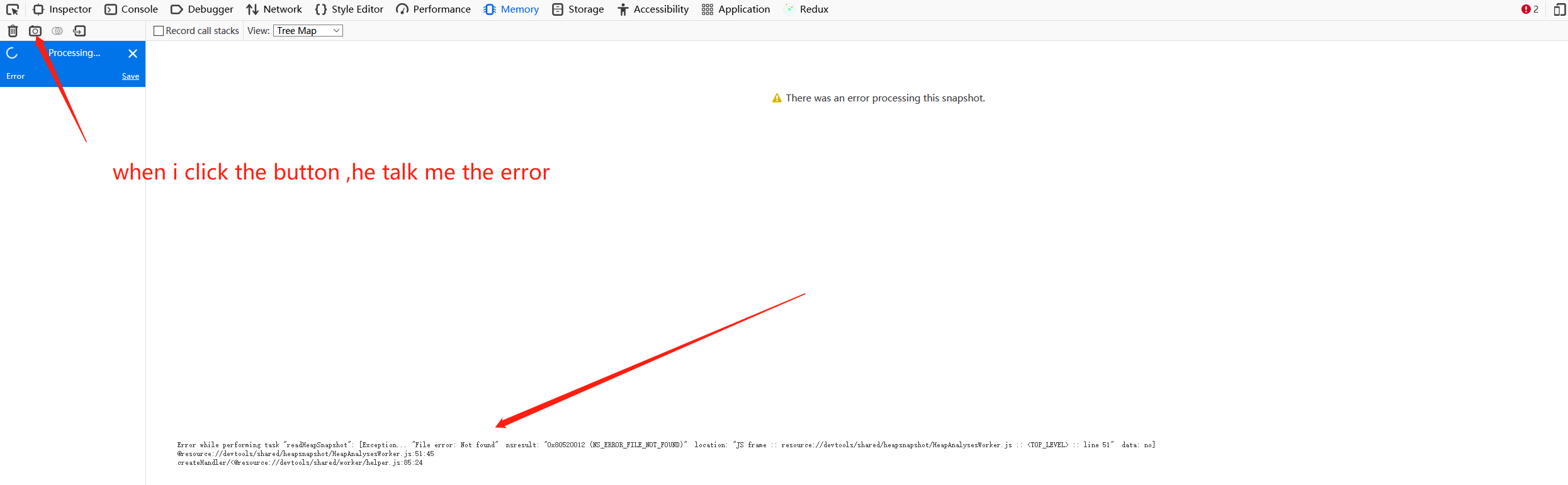 Error while performing task "readHeapSnapshot": [Exception... "File error: Not found" nsresult: "0x80520012 (NS_ERROR_FILE_NOT_FOUND)" location: "JS frame :: resource://devtools/shared/heapsnapshot/HeapAnalysesWorker.js :: <TOP_LEVEL> :: line 51" data: no]