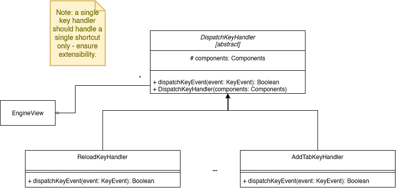 The missing piece here is the Feature class, which would allow registering specific shortcut handlers in applications e.g., Fenix. The feature class would be bound to the view (as most of our features), have access to an EngineView and listen for key events. It would then invoke the corresponding shortcut handler in response to those events.