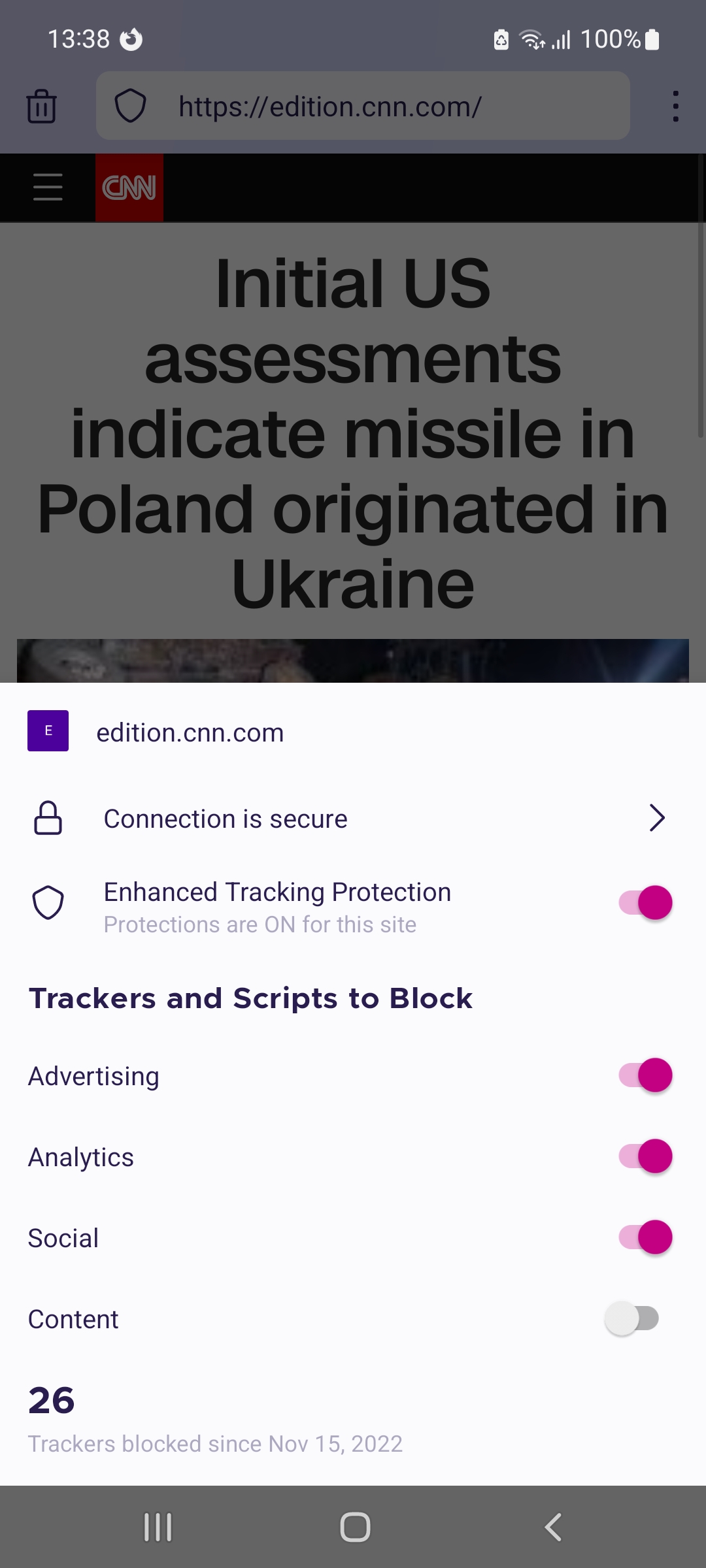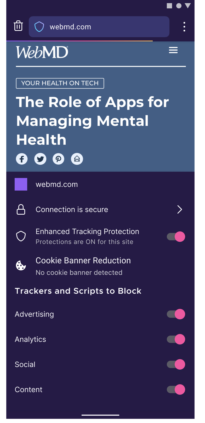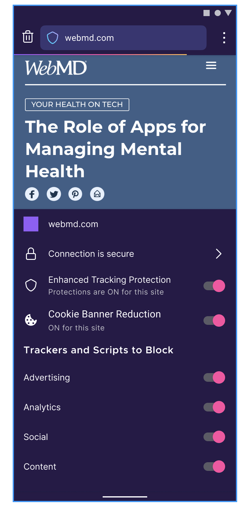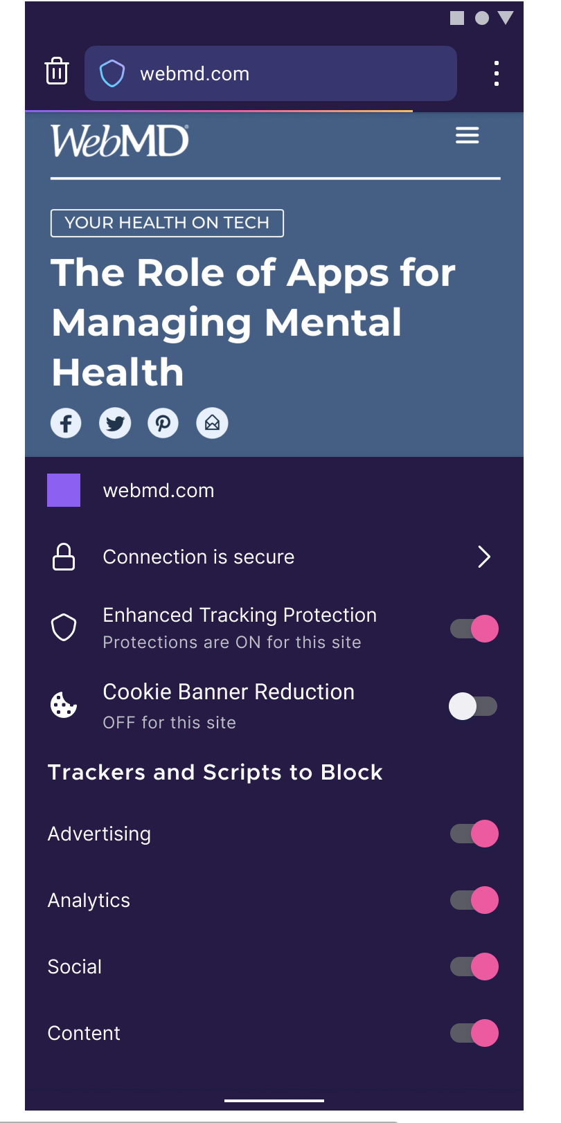 The CBR toggle from the toolbar's menu can be turned ON again, and Focus blocks the cookie banners prompt of the website.