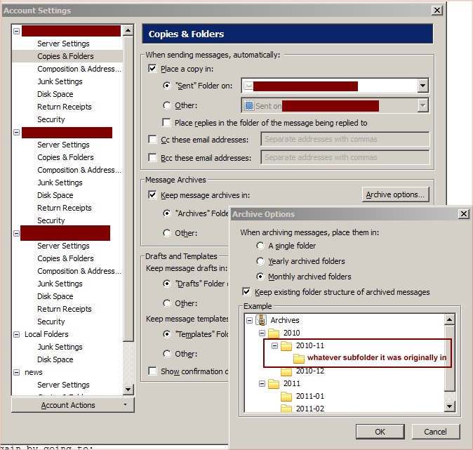 I wasn't aware of this. This at least respected my _monthly_ archiving folder structure. For some of my accounts I had several identities. Changing the archiving settings of an account, only changed the main identity, i.e. after changing settings in Account -> Manage Identities -> Edit -> Copies & Folders for each identity, the subfolders for months were created.